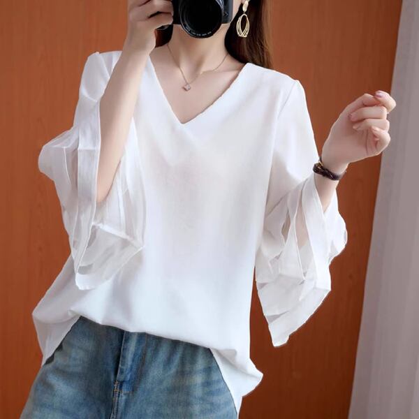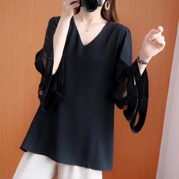 2カラー 大きいサイズ/トランペットスリーブ/シフォンTシャツ レディース トップス ロンT シャツ カットソー ミドル丈 長袖 ベルスリーブ トランペットスリーブ Vネック 襟なし ストレート フォーマル フェミニン シフォン フリル 透け感 大人可愛い 上品 おしゃれ ガーリー クール ルーズ エレガント 清潔感 無地 春 夏 秋 20代 30代 オフィス 通勤 お出かけ イベント ガーデン ショッピング カフェ 体型カバー 大きいサイズ 大きめ オーバーサイズ