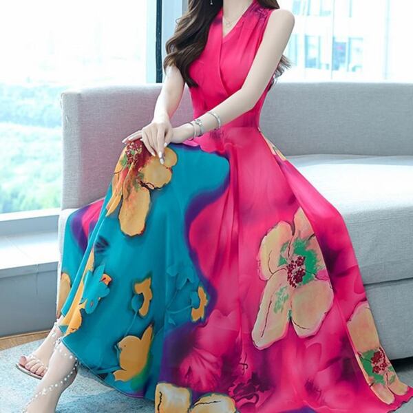 大きいサイズ/ボヘミアン・ホルター ネックビーチドレス ワンピース カラードレスレディース カラースカート フレアスカート ロングスカート ロング 丈長 袖なし ノースリーブ Vネック ホルターネック 肩出し フレア Aライン オーバーサイズ フェミニン シフォン ハイウエスト バイカラー かわいい 大人可愛い カジュアル 上品 おしゃれ エスニック ガーリー エレガント 爽やか プリント 春 夏 秋 20代 30代 お出かけ アウトドア イベント リゾート 海 ビーチ ホテル ガーデン トレンド