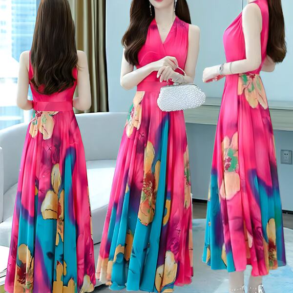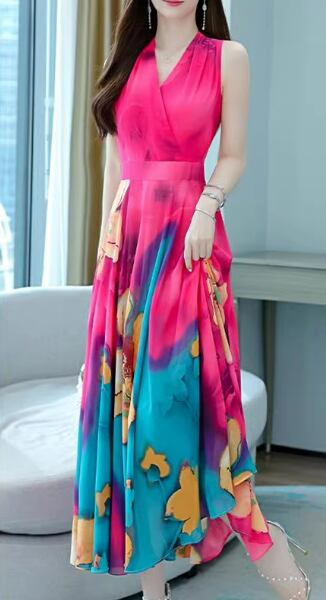 夏のビーチシーンにぴったりな、ボヘミアンスタイルのホルターネックビーチドレス。エキゾチックで、シフォン素材が涼しく、スリムなシルエットで魅力を引き立てます。ロング丈で、足元まで続く美しいプリントが夏の気分を盛り上げます。レディースの夏のおしゃれに、個性的なボヘミアンテイストをプラス。涼やかでエレガントな装いで、ビーチやリゾートでの素敵な時間を演出します。
