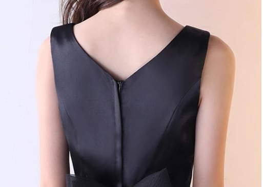 シックなカラーと美しいシルエットが魅力的なノースリーブのイブニングドレス。