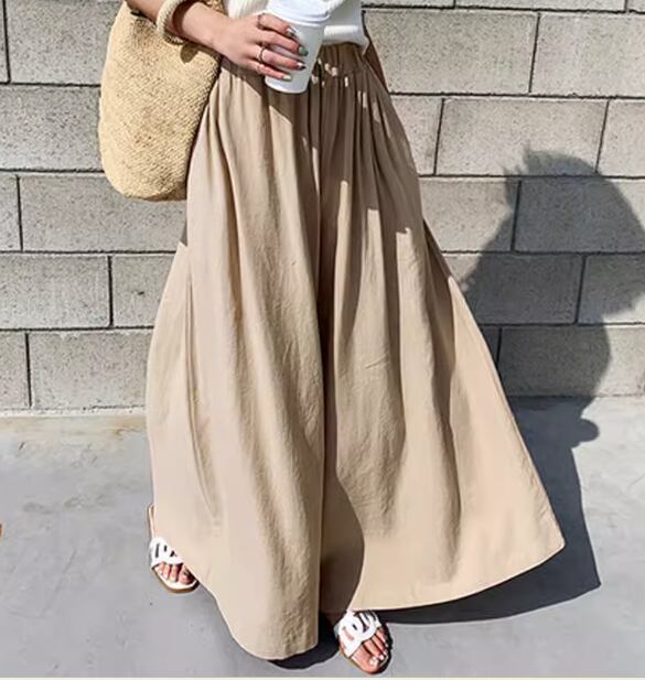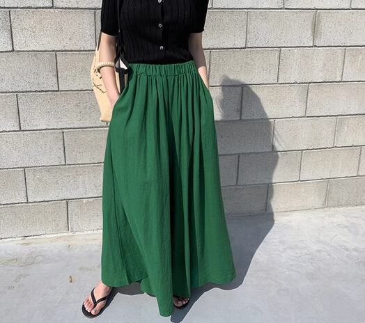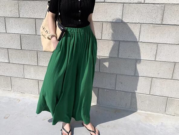 一見スカートに見えるほどの裾幅なのでどんな体形の方でもおしゃれに着こなすことができるアイテム。