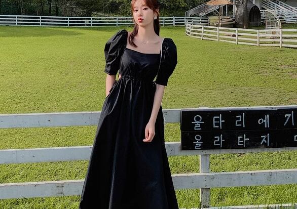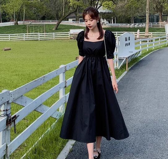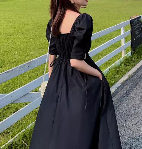 レディース ワンピース プルオーバー ミモレ ロング 半袖 パフスリーブ スクエアネック Aライン フェミニン ポケット 肌見せ かわいい 大人可愛い シンプル カジュアル おしゃれ こなれ感 ガーリー 個性的 モダン 抜け感 ラブリー キュート ラグジュアリー セクシー シック 高級感 無地 夏 10代 20代 学生 デート お出かけ 普段使い トレンド 流行 S M L ブラック