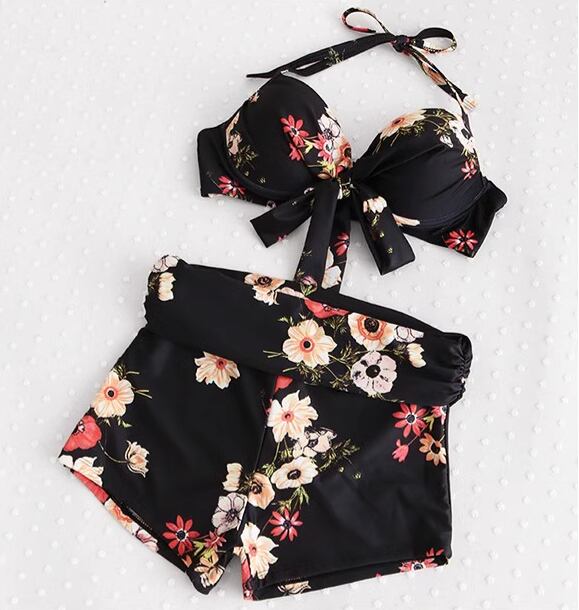 水着 ビキニ レディース 体型カバー ショートパンツ 短パン Tシャツ セパレート ホルターネック パッド付き 半袖 Vネック ハイウエスト セット スリーピース 上下セット かわいい 大人可愛い きれいめ カジュアル 華やか 大人っぽい おしゃれ お洒落 花柄 プリント リゾート 旅行 温泉 プール 夏 海 着痩せ スタイルカバー お腹カバー XL Aカップ Bカップ Cカップ Dカップ Eカップ 貧乳 巨乳 小さい胸用 大きい胸用 小胸さん用 グラマラスさん用 フリーサイズ ブラック