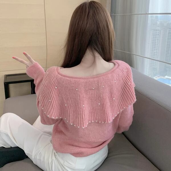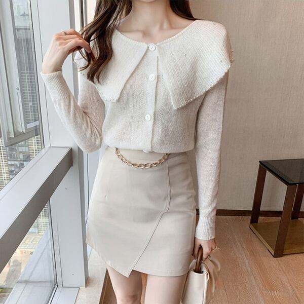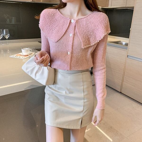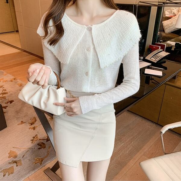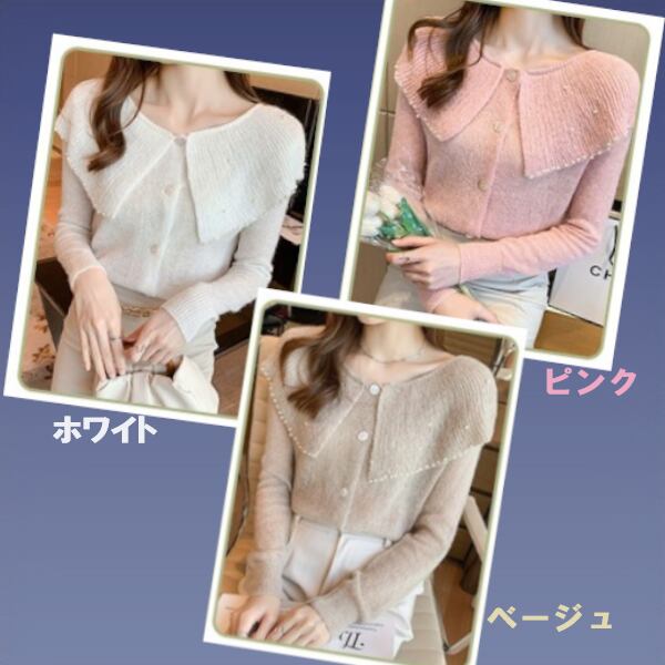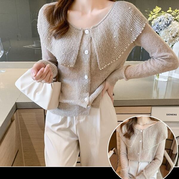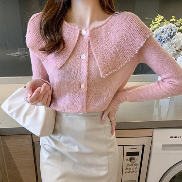 3色展開 大きなラペル/ドールカラーのカーディガン レディース トップス ニット カーディガン サマーニット アウター 上着 ショート 長袖 ケープ襟 ワイド ストレート フェミニン カシミア ボタン ビーズ かわいい 大人可愛い 上品 おしゃれ エレガント 無地 春 秋 10代 20代 OL 通勤 お出かけ パーティー レストラン ホテル ショッピング 韓国 トレンド