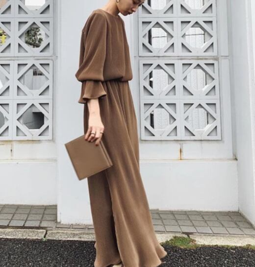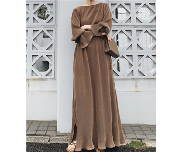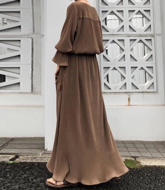 レディース ワンピース ドレス ロング マキシ 長袖 ベルスリーブ ラウンドネック Aライン ウエストマーク 大人可愛い シンプル カジュアル 上品 おしゃれ レトロ ラフ ガーリー ルーズ 個性的 ナチュラル リラックス シック 高級感 優しい 穏やか 無地 春 秋 デート お出かけ パーティー イベント 体型カバー 普段使い S M L XL ゆったり ブラウン
