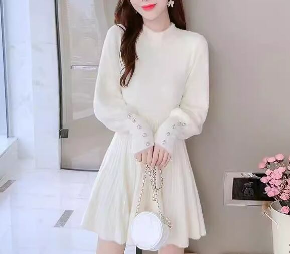 ボリューム感のある袖の部分についたボタンとスカート部分のプリーツがおしゃれな膝上丈のニットワンピース。
