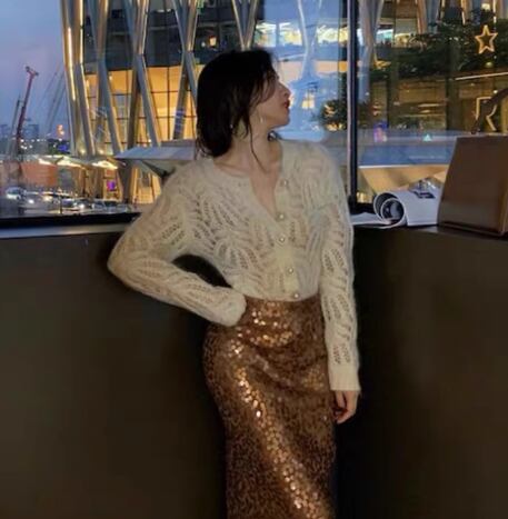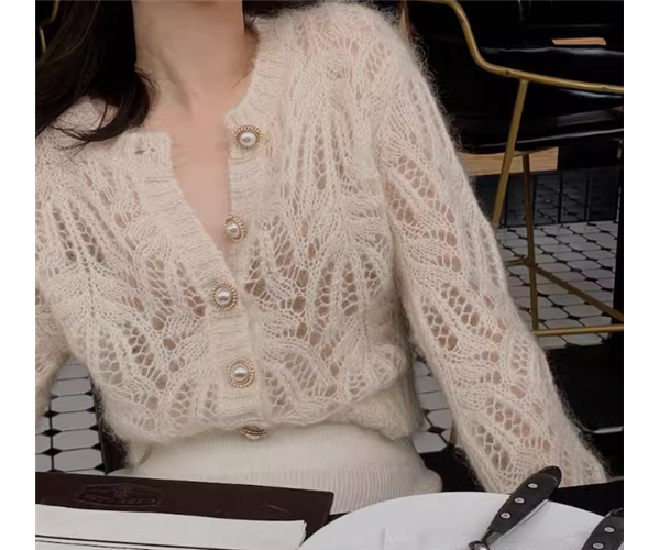 上品で女性らしいデザインが魅力的な薄手のニットカーディガン。