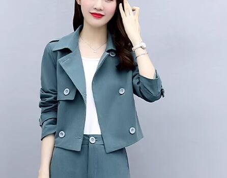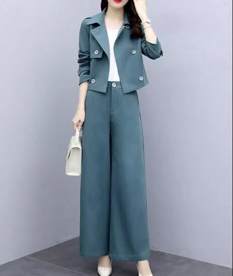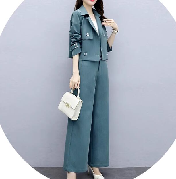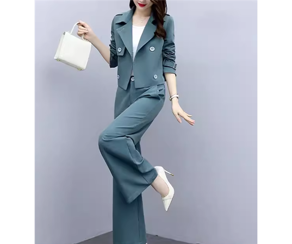 落ち着いたブルーの色味が爽やかで大人可愛いカジュアルスーツの上下セット。