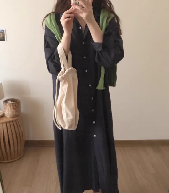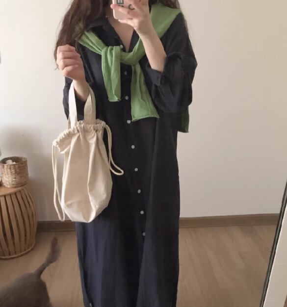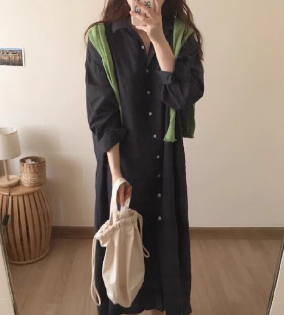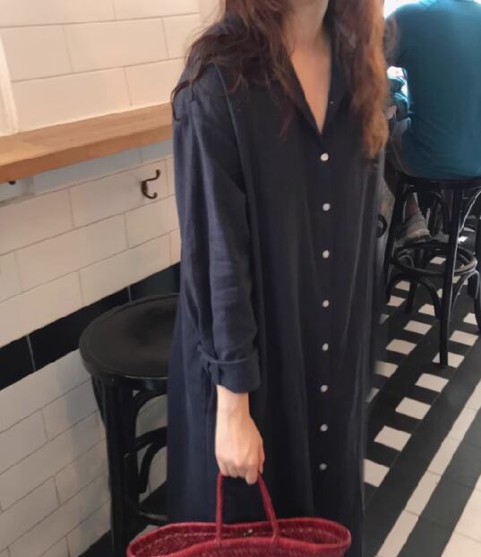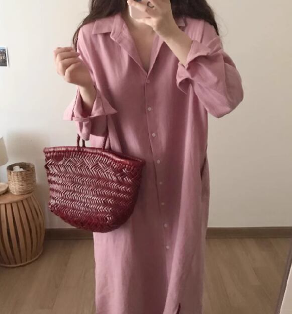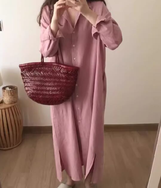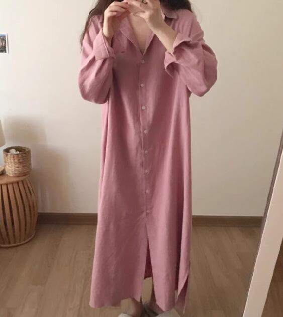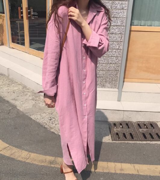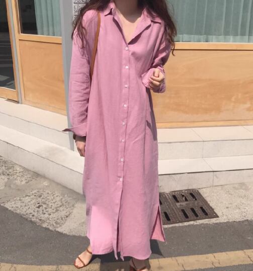 レディース ワンピース シャツワンピ ロング マキシ 長袖 襟付き ポロカラー ストレート ポケット 前開き ボタン リネン 綿 コットン 大人可愛い シンプル カジュアル おしゃれ レトロ ラフ ガーリー ルーズ クール ナチュラル シック 高級感 優しい 穏やか 無地 春 デート お出かけ 体型カバー 普段使い S M L XL ゆったり ゆる 大きめ オーバーサイズ ピンク ブルー