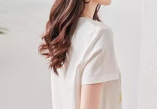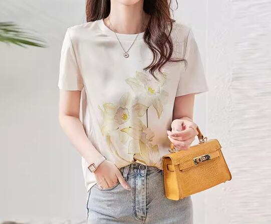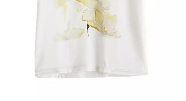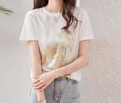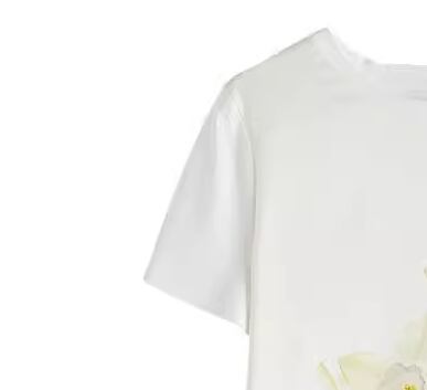 上品でエレガントな花柄模様が美しい半袖Tシャツ。