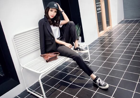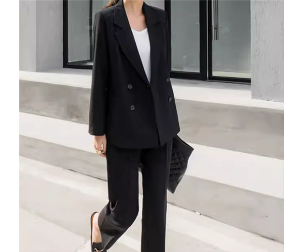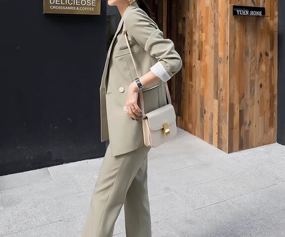 スマートなシルエットが魅力的なカジュアルスーツの上下セット。