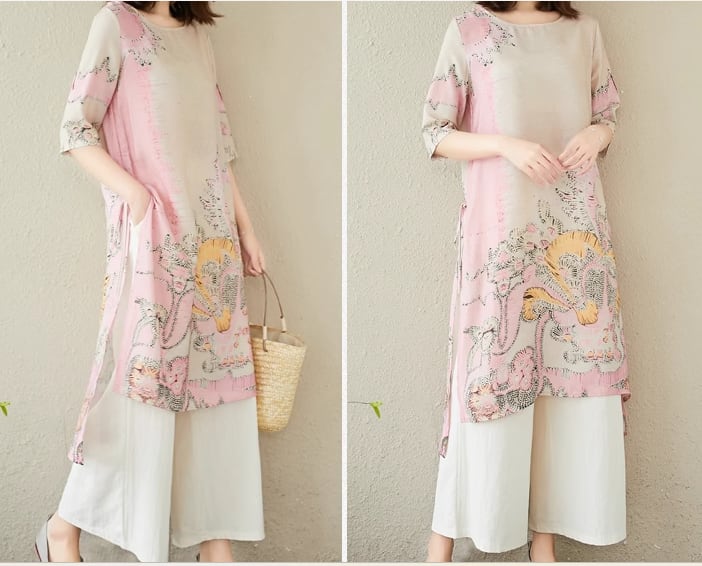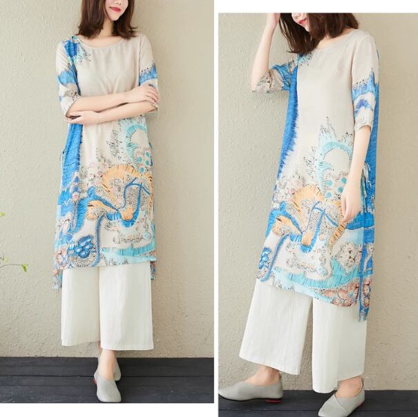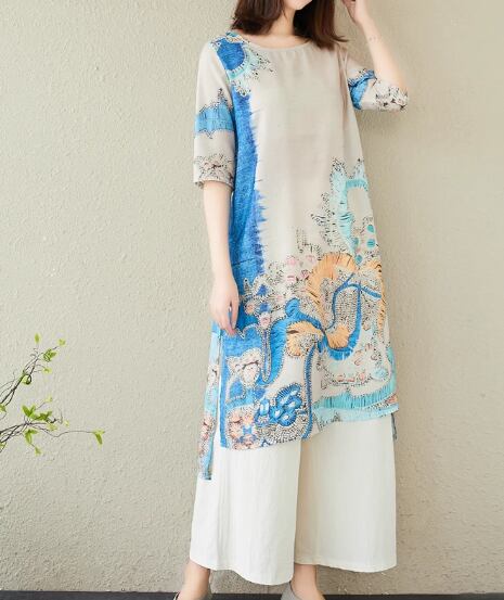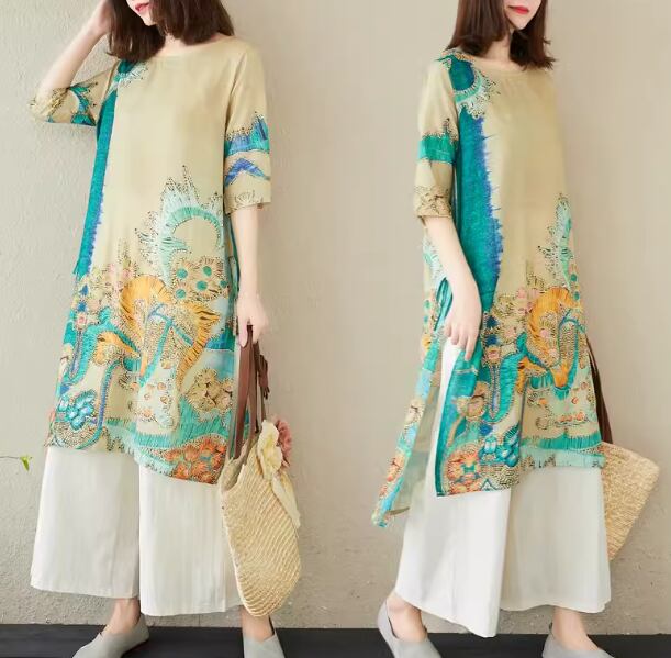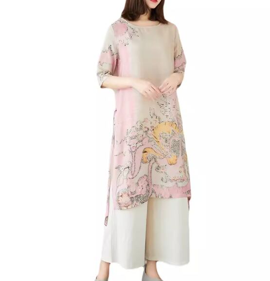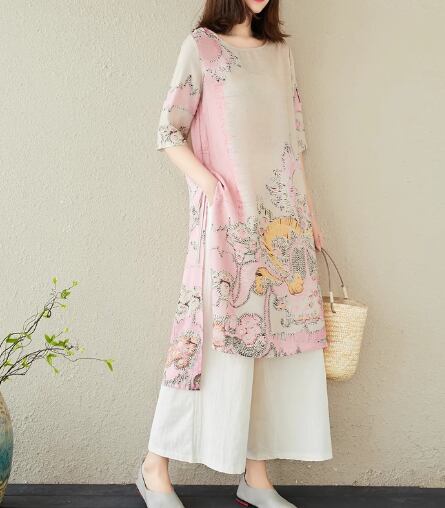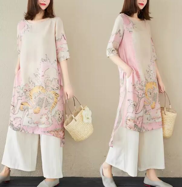 二点セット 上下セット ツーピース レディース トップス パンツ プルオーバー ワイドパンツ ロング フルレングス 5分袖 ラウンドネック スリット ポケット ウエストゴム 異国風 リネン 綿 コットン 大人可愛い きれいめ カジュアル 上品 おしゃれ かっこいい レトロ アジアン ラフ ボーイッシュ ルーズ 個性的 クール エレガント 存在感 豪華 リラックス ハンサム シック 高級感 芸術的 プリント 夏 デート お出かけ 体型カバー 普段使い 着回し M L XL ゆったり ピンク ブルー グリーン