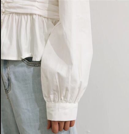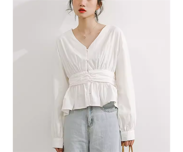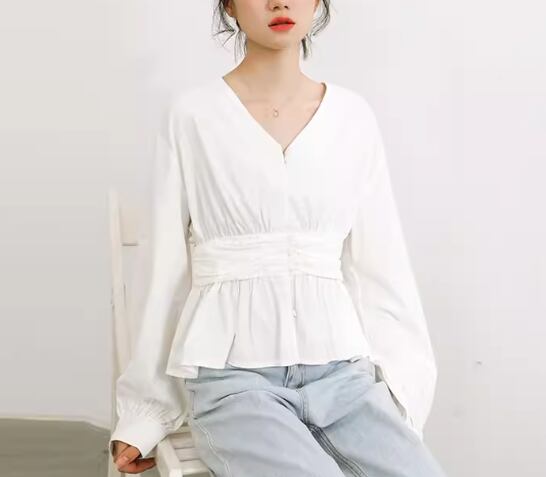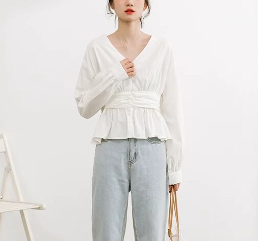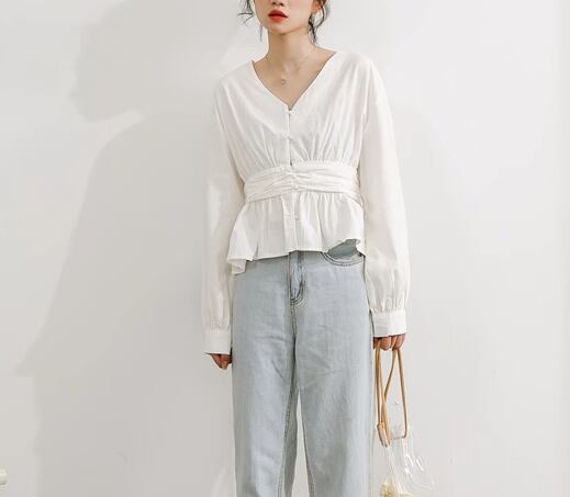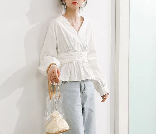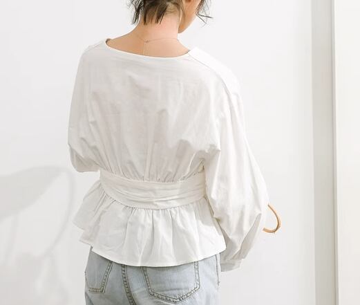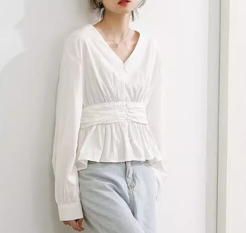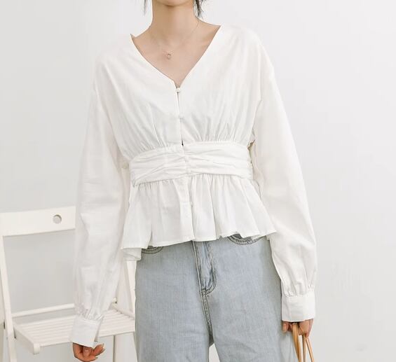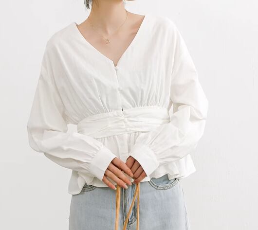 レディース トップス シャツ ショート 長袖 Vネック フェミニン フリル ウエストマーク ボタン コットン かわいい 大人可愛い きれいめ シンプル カジュアル 上品 おしゃれ レトロ ルーズ エレガント ナチュラル 清潔感 シック 高級感 優しい 穏やか フェアリー 無地 秋 デート お出かけ 韓国 体型カバー 普段使い 着回し 清楚 トレンド 流行 ゆったり ゆる フリーサイズ 大きめ オーバーサイズ ホワイト