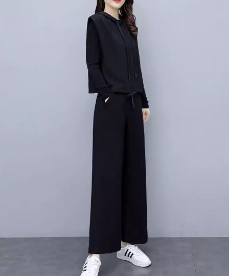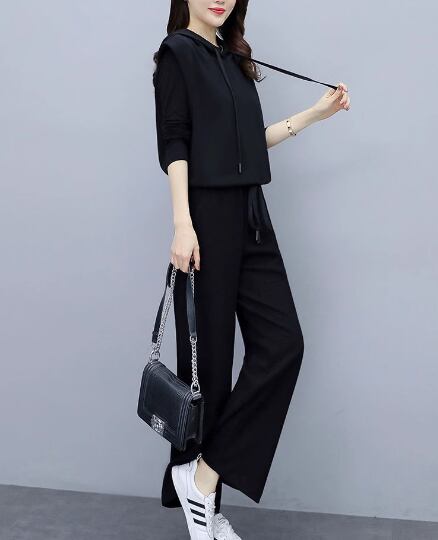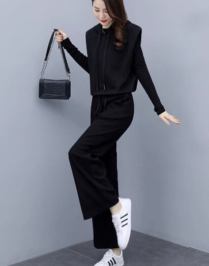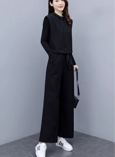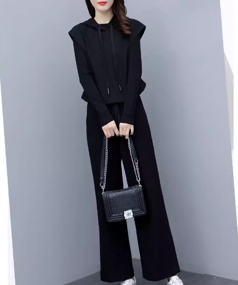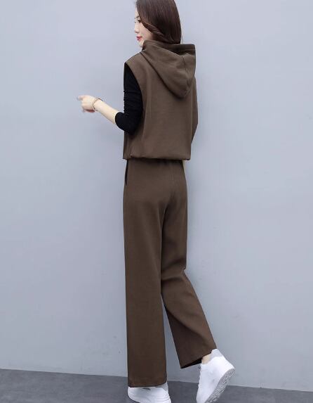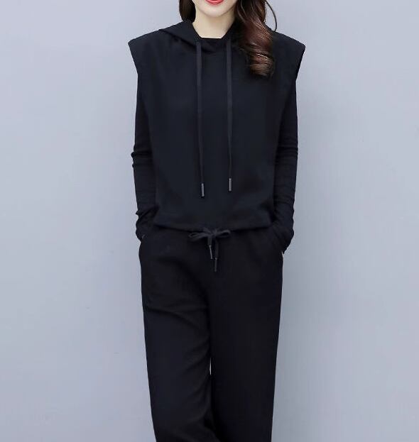 プルオーバータイプのノースリーブパーカーとシンプルな無地のインナー、フルレングスのパンツの三点セットです。