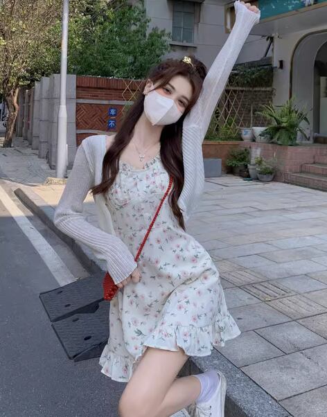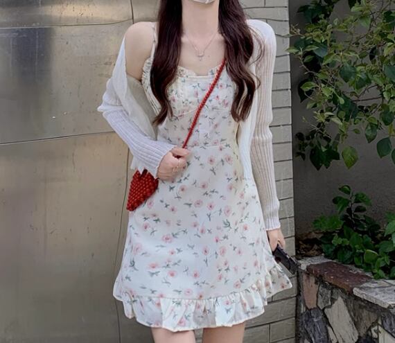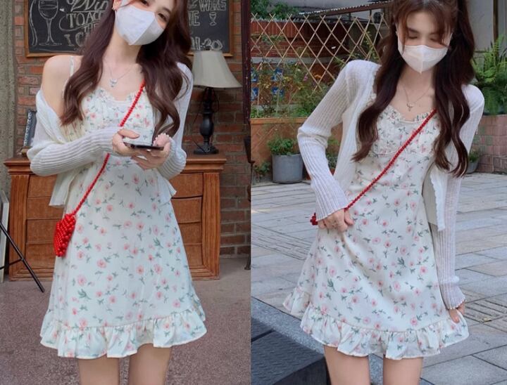 女性らしくて可愛い小花柄のノースリーブワンピースとショート丈の長袖カーディガンの二点セット。