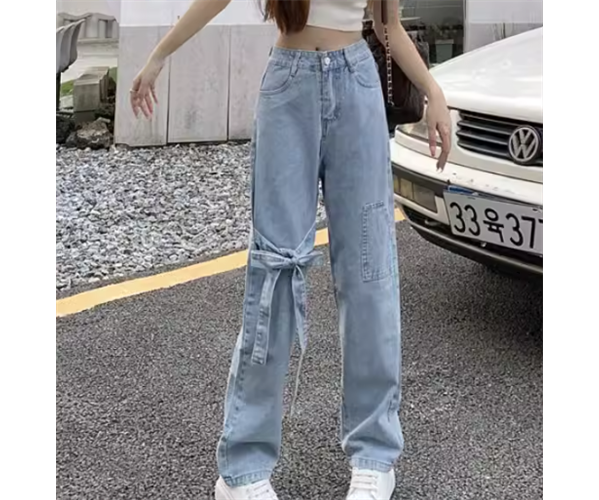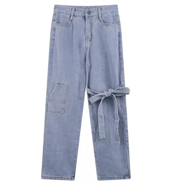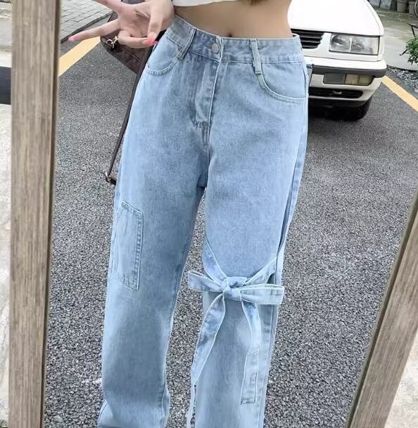 レディース パンツ ボトムス デニム ジーンズ Gパン デニムパンツ フルレングス ワイド ストレート フェミニン リボン ファスナー ポケット 薄手 かわいい シンプル カジュアル おしゃれ ラフ ガーリー ルーズ 個性的 キュート シック 高級感 スタイリッシュ 無地 春 夏 10代 20代 学生 デート お出かけ 体型カバー 普段使い 着回し S M L XL ゆったり ブルー