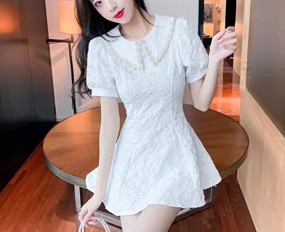 レディース ドレス ワンピース パーティードレス パーティー ミニ ショート 半袖 パフスリーブ 襟付き スリム 細身 Aライン ファスナー ハイウエスト プルオーバー パール 可愛い きれいめ シンプル 大人可愛い 上品 おしゃれ キュート ガーリー エレガント 清楚 セクシー シック 華やか ラグジュアリー 高級感 フェミニン 女性らしい フェアリー イベント ホテル レストラン デート 食事会 夏 S M L XL 小さめ フィット ホワイト