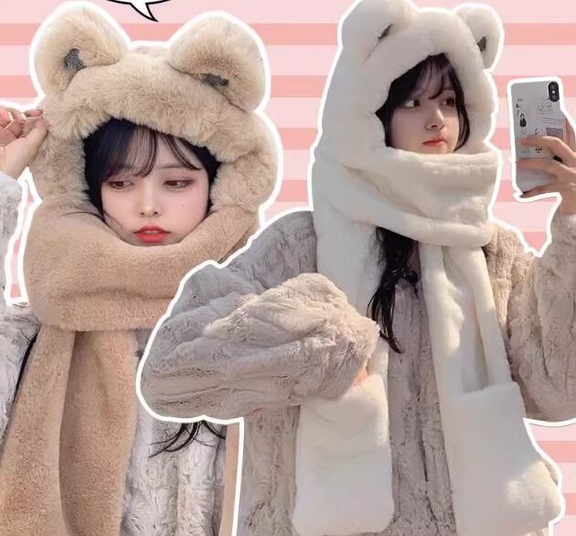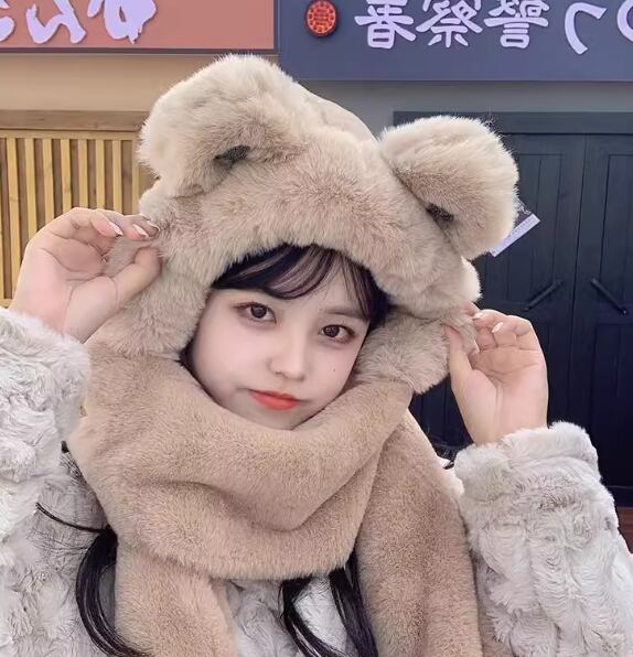 クマ耳付きの帽子、マフラー、手袋が一体化した防寒対策にぴったりのアイテムです。