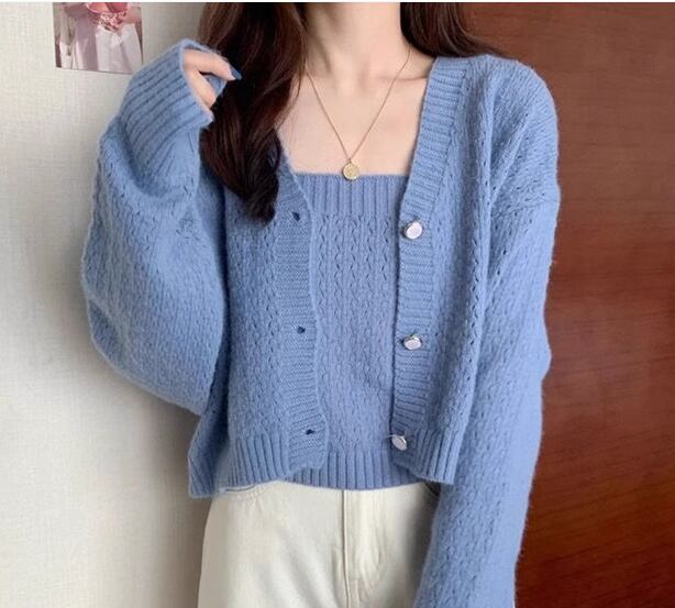 二点セット ツーピース レディース トップス ニット カーディガン キャミソール アンサンブル 袖なし ノースリーブ 長袖 Vネック フェミニン 前開き ボタン かわいい 大人可愛い きれいめ シンプル カジュアル 上品 おしゃれ レトロ ラフ クール エレガント ナチュラル シック 高級感 優しい 穏やか 無地 春 デート お出かけ 重ね着 普段使い 着回し レイヤード フリーサイズ ブラック ブルー アプリコット