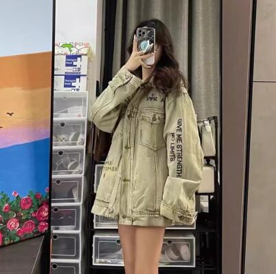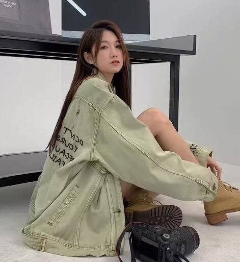 レディース ジャケット アウター 上着 デニム デニムジャケット Gジャン ミドル丈 長袖 襟付き ポロカラー 刺繍 ボタン アメカジ ウォッシュ カラーデニム カジュアル おしゃれ かっこいい レトロ メンズライク ボーイッシュ ルーズ 個性的 クール ラグジュアリー アメリカン アクティブ ワイルド ハンサム シック 高級感 スタイリッシュ 文字 テキスト 英語 秋 10代 20代 学生 デート お出かけ 体型カバー 普段使い 着回し S M L XL ゆったり グリーン