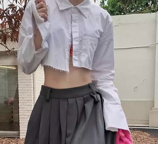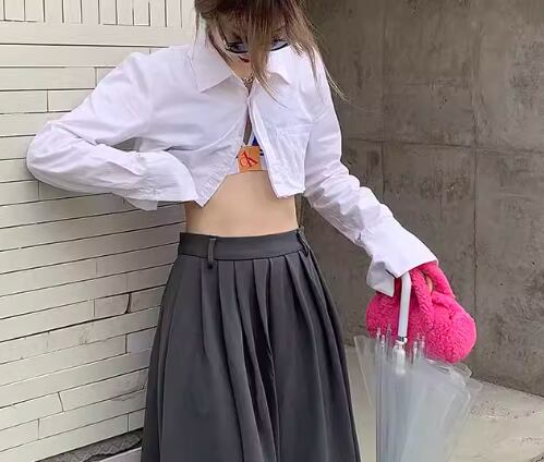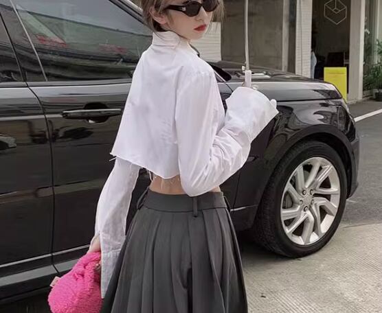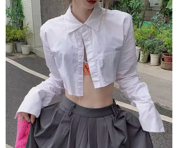 トレンドのクロップド丈が特徴的な白の長袖シャツ。
