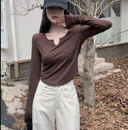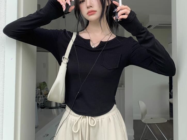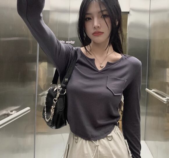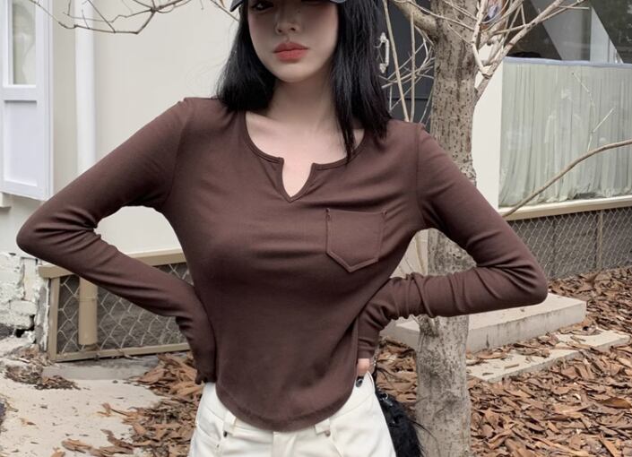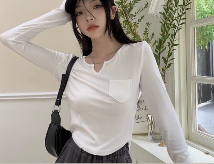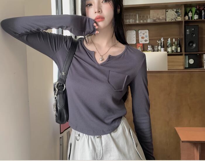 レディース トップス カットソー プルオーバー インナー Tシャツ ショート 長袖 Vネック スリム 細身 ポケット シンプル カジュアル おしゃれ かっこいい レトロ ラフ メンズライク ボーイッシュ クール ナチュラル ハンサム シック 無地 秋 デート お出かけ 普段使い 着回し S M L XL 小さめ ホワイト ブラック ブラウン グレー