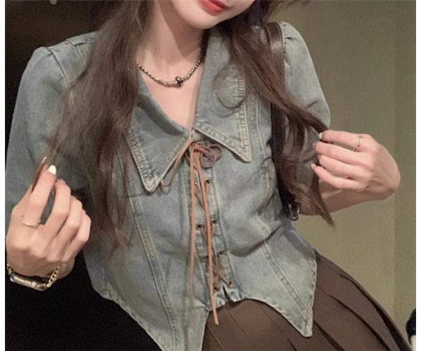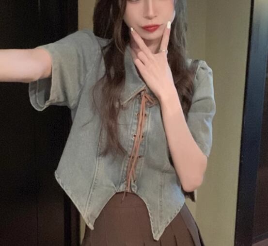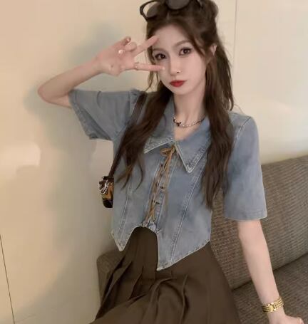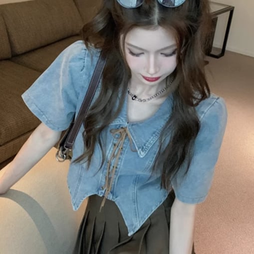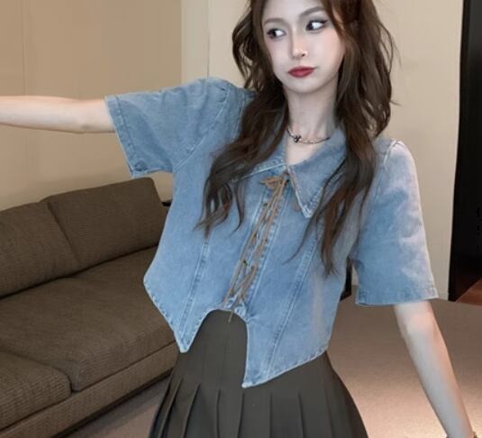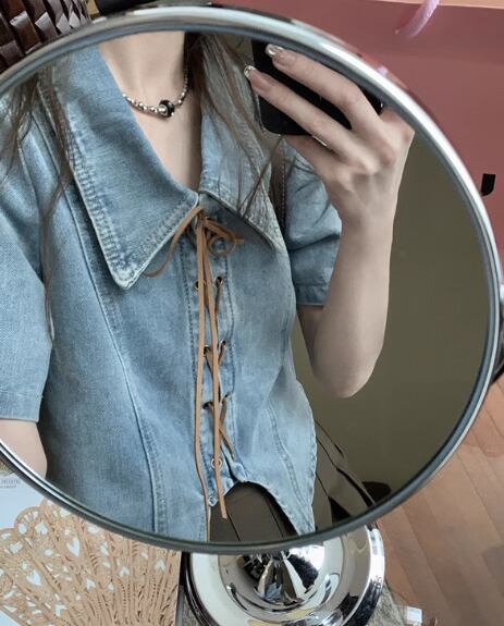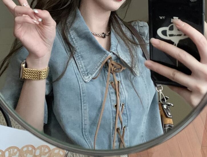 レディース トップス シャツ デニム ショート 半袖 襟付き ポロカラー ストレート 編み上げ レースアップ ブルーデニム かわいい 大人可愛い シンプル カジュアル おしゃれ かっこいい ボーイッシュ 個性的 クール キュート ラグジュアリー アクティブ ハンサム シック 高級感 スタイリッシュ 無地 夏 10代 20代 学生 デート お出かけ 普段使い 着回し トレンド 流行 S M L ブルー