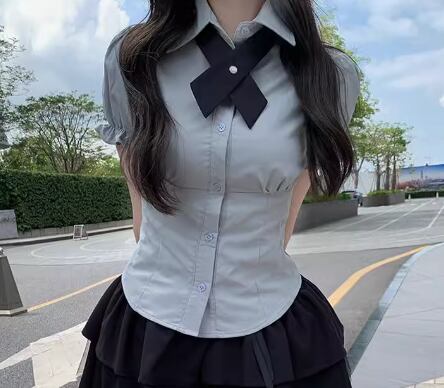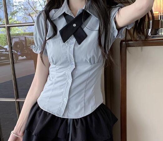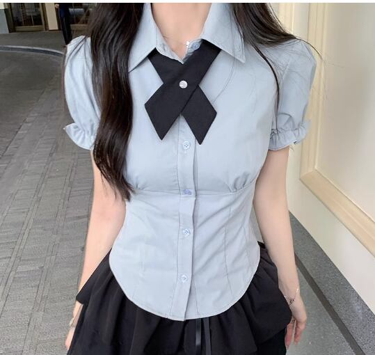 制服風のデザインが可愛い半袖シャツ。
