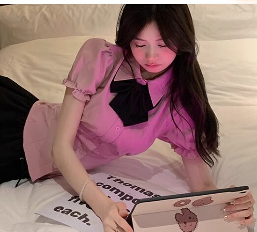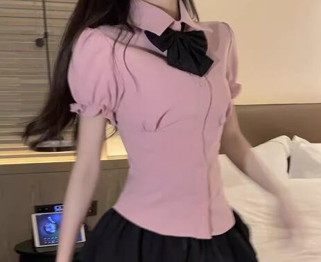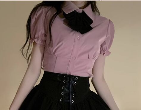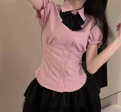 レディース トップス シャツ ショート 半袖 パフスリーブ 襟付き ポロカラー タイト スリム 細身 フェミニン フリル 前開き ボタン かわいい 大人可愛い きれいめ シンプル 上品 おしゃれ レトロ エレガント キュート クラシカル カレッジ風 学生風 知的 清潔感 セクシー シック 高級感 無地 夏 10代 20代 学生 デート お出かけ 普段使い 着回し モテ S M L XL フィット ピンク ブルー