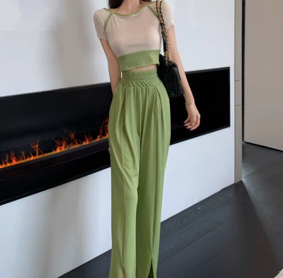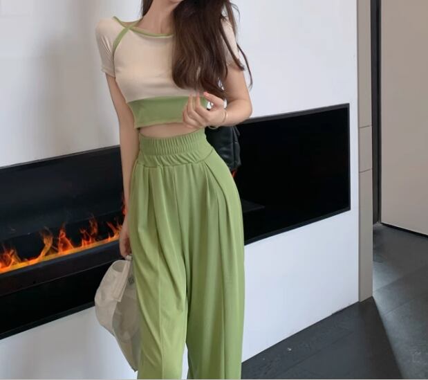 クロップド丈の半袖トップスとハイウエストタイプのストレートパンツの二点セットです。