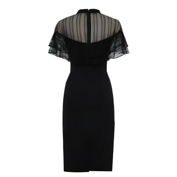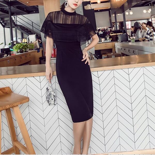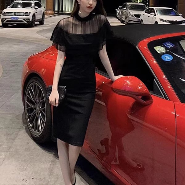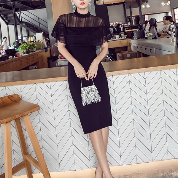 夏の夜に相応しいエレガントなブラックドレス!ミッドレングスでスリムなシルエットが魅力。ヒップハグ効果で女性らしい曲線美を強調し、ヘップバーンスタイルの洗練された雰囲気を演出。フレンチスクエアショルダーが肩を美しく見せ、メッシュスリットとスプライシングがセクシーさをプラス。クラシカルなレースとモダンなメッシュの組み合わせが絶妙で、上品な印象を与えます。特別なイベントやデートにぴったりの一着です。