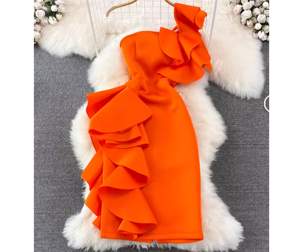 鮮やかな発色が美しいミモレ丈のワンショルデザインドレス。