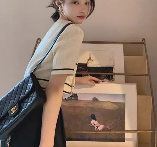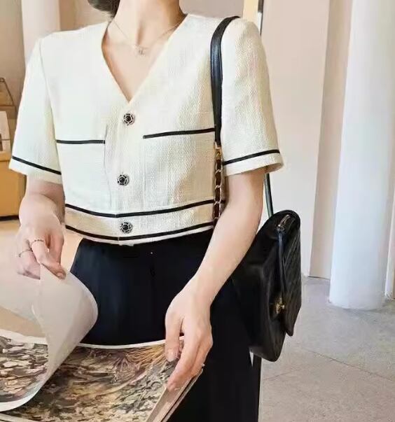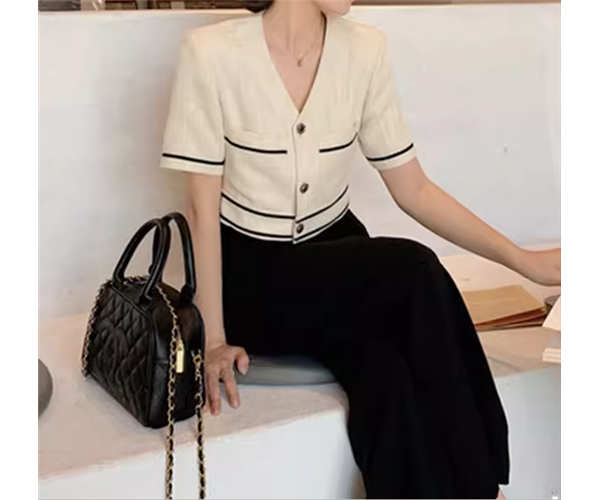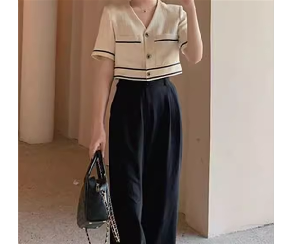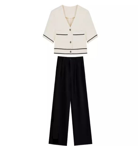 オフホワイトの半袖トップスと黒のフルレングスワイドパンツの二点セットです。