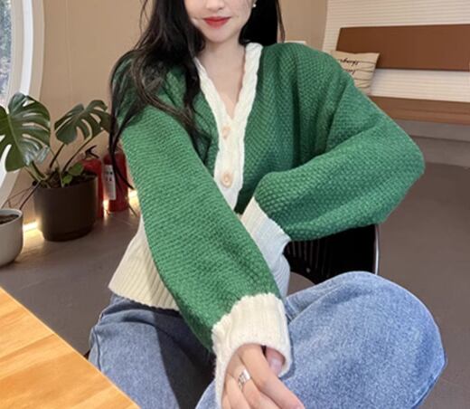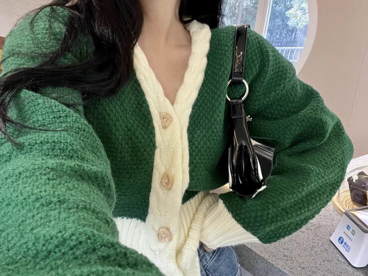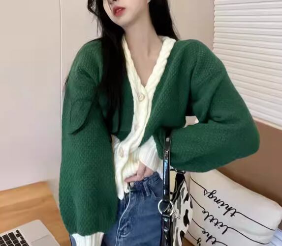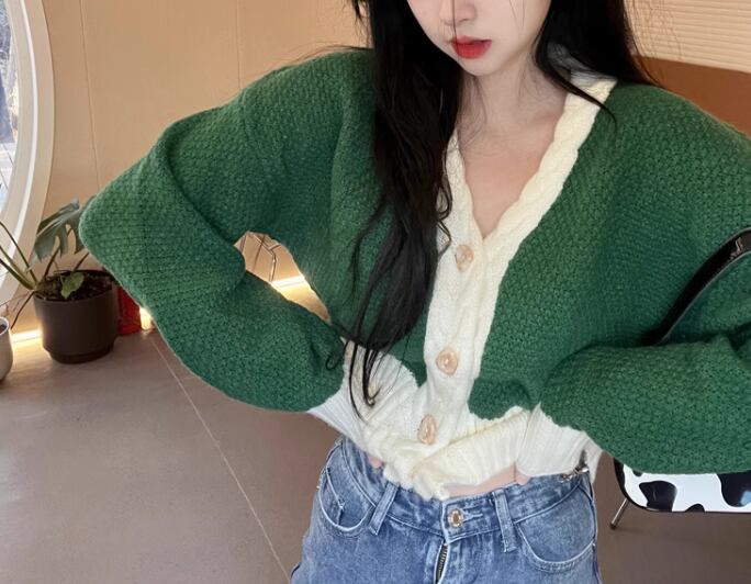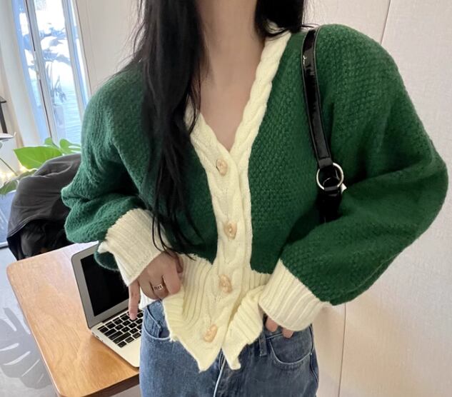 レディース トップス ニット セーター カーディガン ショート 長袖 ボリューム袖 バルーン袖 ランタンスリーブ Vネック 前開き ボタン バイカラー かわいい カジュアル おしゃれ レトロ ラフ ボーイッシュ ルーズ クール 存在感 キュート ラグジュアリー アクティブ シック 無地 春 デート お出かけ 普段使い 着回し トレンド 流行 S M L ゆったり ゆる 大きめ オーバーサイズ グリーン