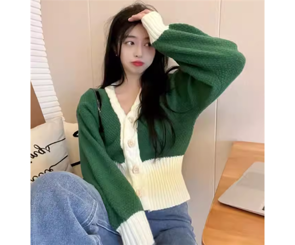 グリーン×オフホワイトの二色使いがおしゃれな長袖のニットカーディガン。