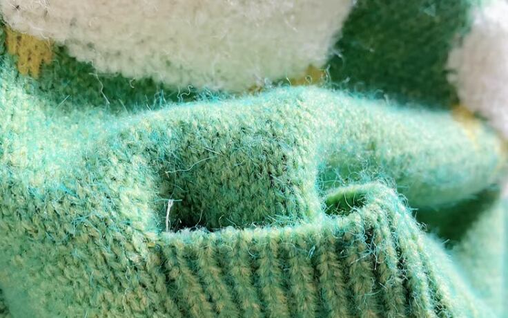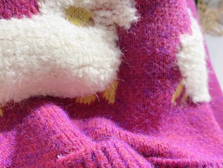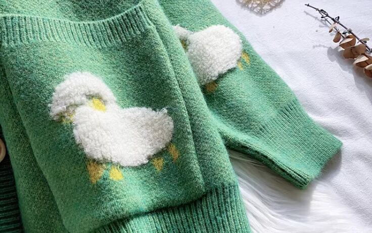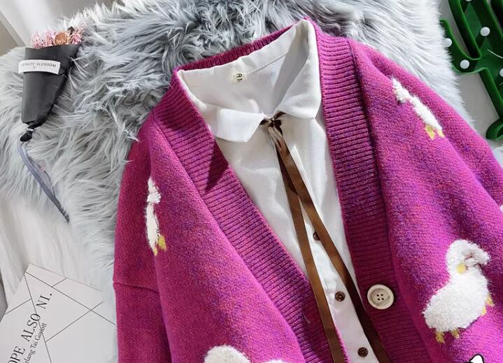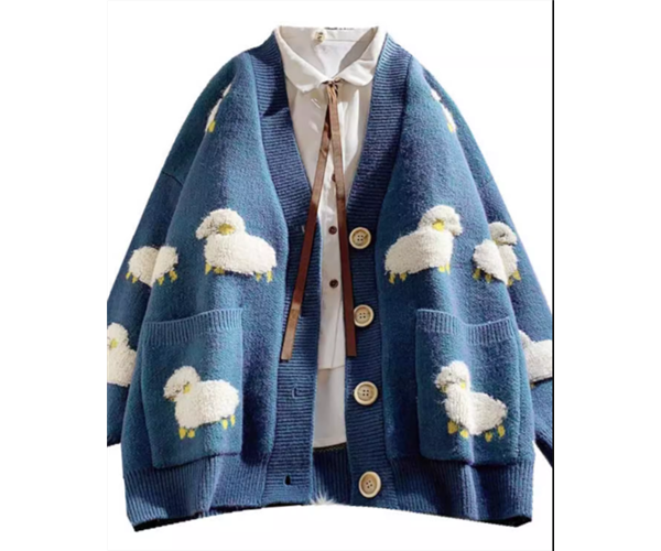 可愛らしいひつじ柄が目を引く厚手のニットカーディガン。