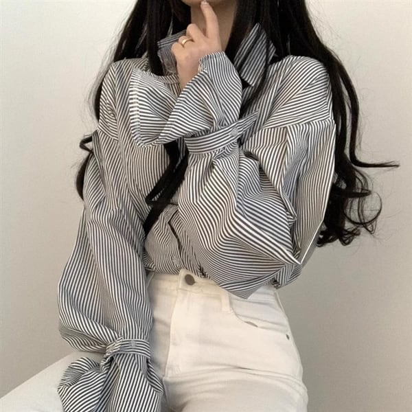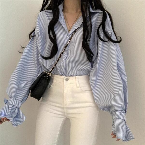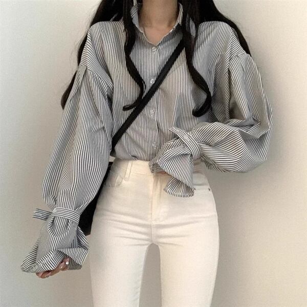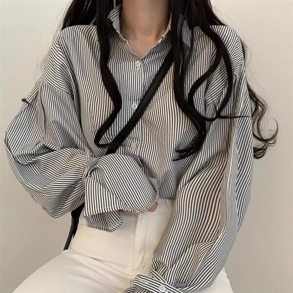 2色展開 フレンチストライプカジュアルシャツ レディース トップス シャツ ブラウス ミドル丈 長袖 ランタンスリーブ ステンカラー ストレート 大人可愛い きれいめ シンプル カジュアル 上品 おしゃれ ルーズ エレガント フォーマル 清潔感 爽やか オフィスカジュアル ストライプ シーズンレス 10代 20代 30代 オフィス 通勤 お出かけ アウトドア イベント ガーデン ショッピング カフェ 韓国 普段使い トレンド 動きやすい ゆったり