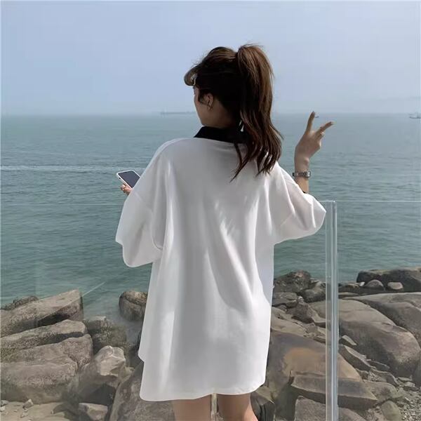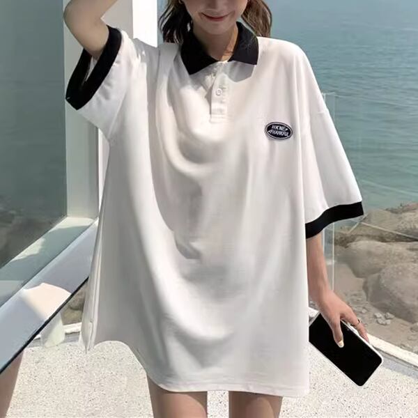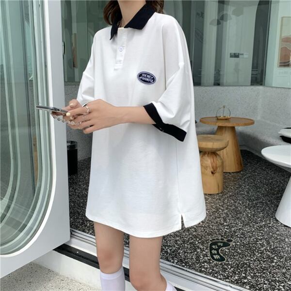 カレッジスタイル/半袖ポロシャツ男女兼用 ユニセックス レディース トップス ロンT シャツ Tシャツ ミドル丈 半袖 ポロカラー ワイド バイカラー 伸縮性 かわいい 大人可愛い きれいめ カジュアル ルーズ シンプル 上品 ガーリー ボーダー 文字 ワンポイント 春 夏 秋 ロングシーズン 10代 20代 オフィス 通勤 公園 ガーデン カフェ 普段使い 定番 ゆったり オーバーサイズ