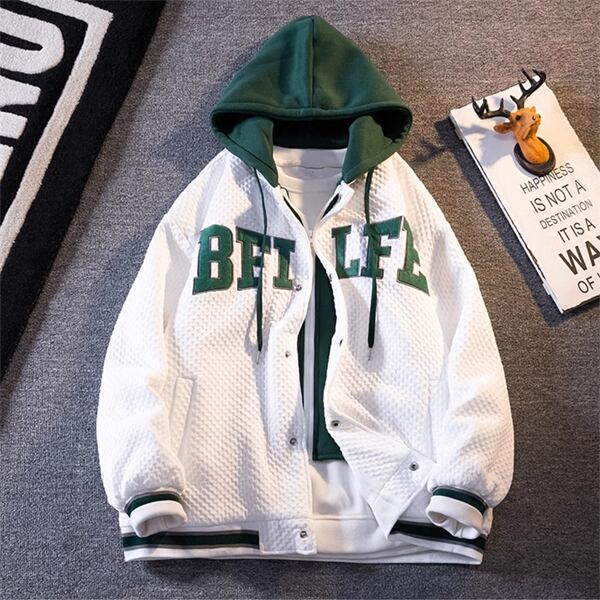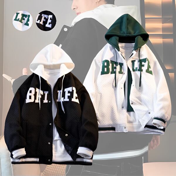 2色展開 メンズ フェイクレイヤード ユニセックス トップス パーカー ブルゾン アウター スタジャン MA-1 フェイクツーピース 長袖 フード ストリート ファスナー ボタン カジュアル おしゃれ かっこいい こなれ感 レトロ ルーズ カレッジ風 爽やか ボーダー 文字 英語 春 秋 冬 男女兼用 10代 20代 通勤 通学 アウトドア キャンプ ガーデン ライブ ツーリング 韓国 普段使い トレンド ゆったり