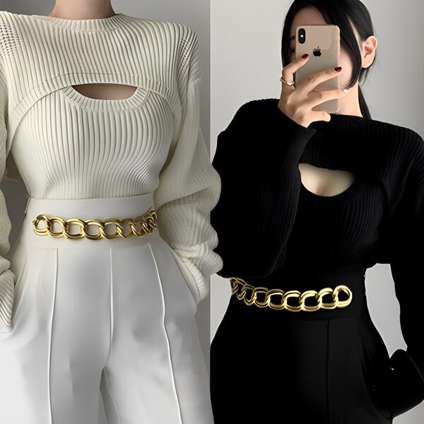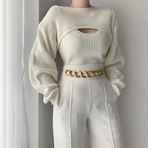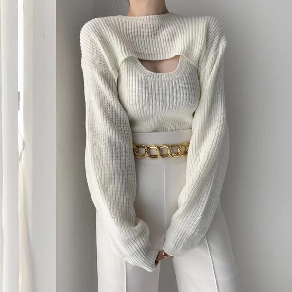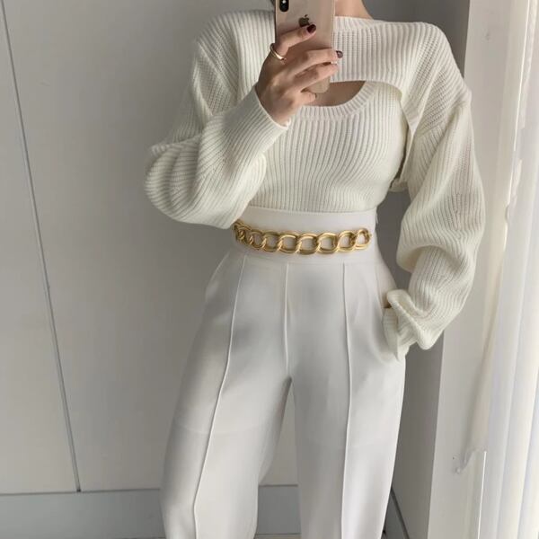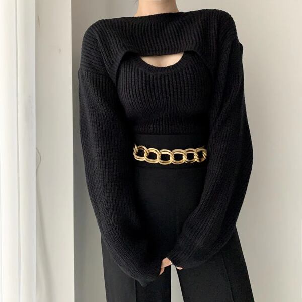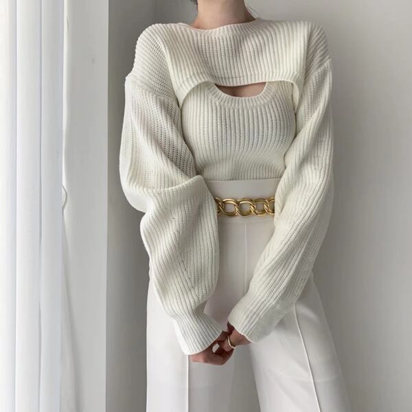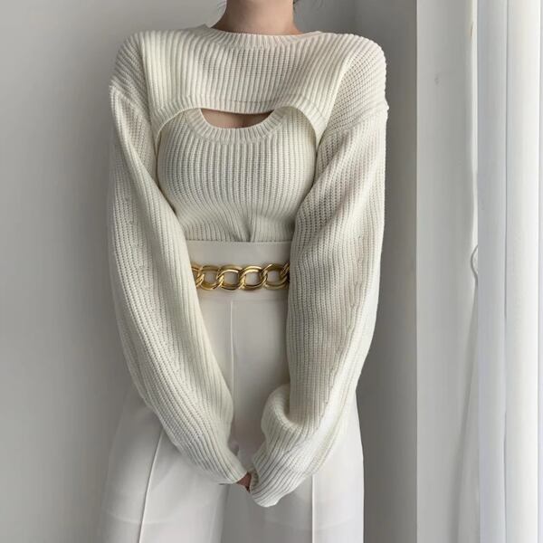 スリムなベストとショートセーターがセットになったアウターウェア2点セット。カジュアルながらもスタイリッシュなデザインが特徴で、様々なシーンで活躍します。スリムベストはシンプルながらもエレガントな印象を与え、体のラインを美しく引き立てます。一方、ショートセーターは暖かみのある素材で、着心地も抜群です。セットでなので、コーディネートの手間も省けます。おしゃれなアウターウェアとしてお勧めです。