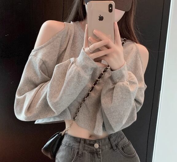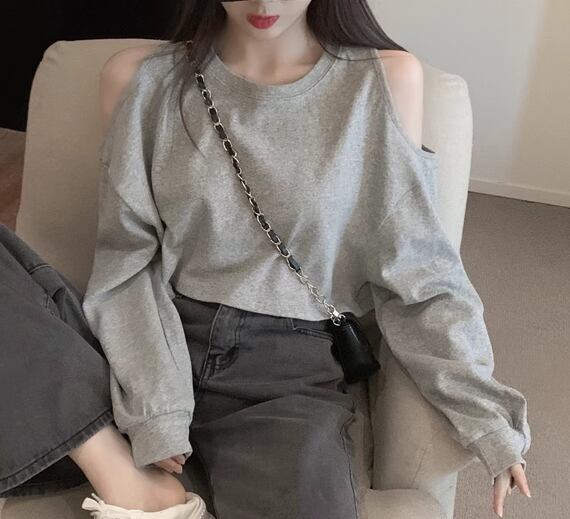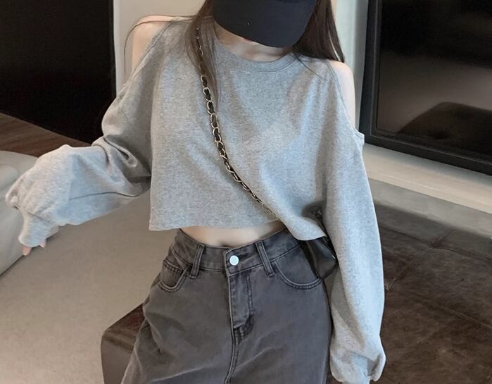 レディース トップス カットソー プルオーバー Tシャツ ショート クロップド丈 長袖 ラウンドネック オフショルダー 肌見せ 肩出し かわいい シンプル カジュアル おしゃれ かっこいい こなれ感 ラフ ボーイッシュ スポーティー ルーズ クール 抜け感 ラグジュアリー アクティブ セクシー ハンサム シック 高級感 スタイリッシュ 無地 春 秋 10代 20代 学生 デート お出かけ 普段使い 着回し トレンド 流行 ゆったり フリーサイズ ホワイト グレー