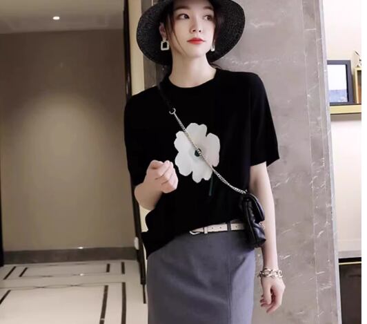 レディース トップス カットソー プルオーバー Tシャツ ミドル丈 半袖 ラウンドネック ストレート 薄手 かわいい 大人可愛い シンプル カジュアル おしゃれ ラフ ガーリー 存在感 キュート ナチュラル シック 高級感 スタイリッシュ 花柄 フラワー 夏 デート お出かけ 普段使い 着回し S M L XL ブラック
