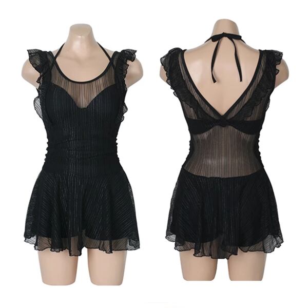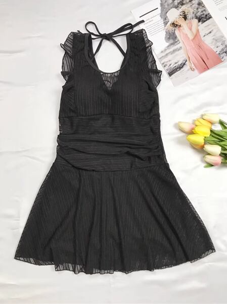 コンサバティブ/スカートワンピース水着 レディース スイムウェア ワンピース スカートスタイル ホルターネック ノースリーブ レース シースルー バックレス かわいい 大人可愛い シンプル カジュアル 大人っぽい モード系 フェミニン 無地 温泉 プール 夏 海 モテ 背中見せ ブラック