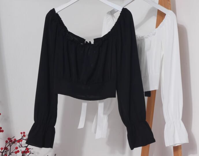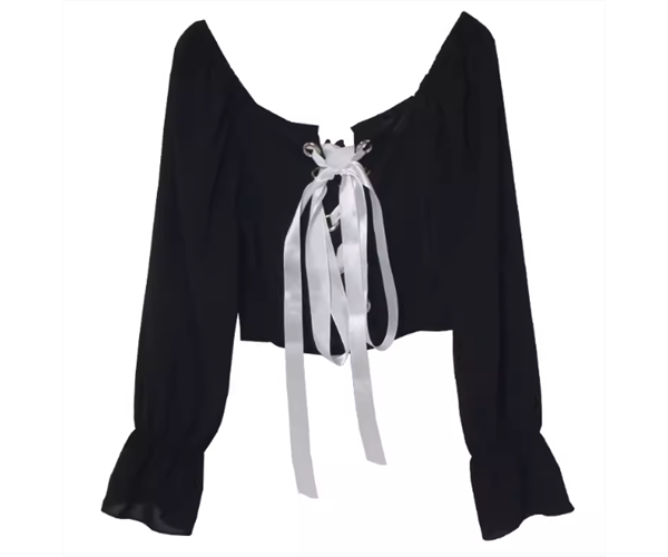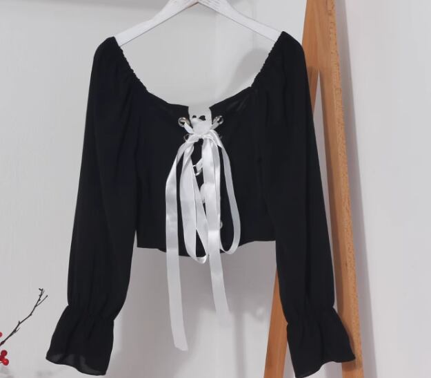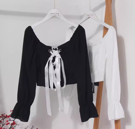 レディース トップス カットソー プルオーバー ショート クロップド丈 長袖 ベルスリーブ スクエアネック スリム 細身 背中開き フェミニン シフォン フリル リボン 編み上げ レースアップ かわいい 大人可愛い シンプル カジュアル おしゃれ こなれ感 ガーリー 抜け感 キュート ラグジュアリー アクティブ セクシー シック スタイリッシュ 無地 春 10代 20代 学生 デート お出かけ 普段使い 着回し トレンド 流行 フリーサイズ 小さめ ホワイト ブラック