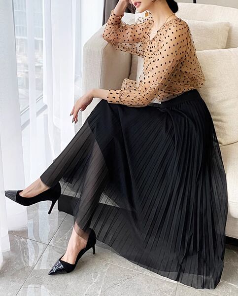 シンプルでエレガントなプリーツスカートです。ミドル丈で大人っぽく、ハイウエストのデザインが美しいウエストラインを演出します。Aラインシルエットが女性らしい曲線を強調し、華やか。様々なトップスとの相性が良く、幅広いコーディネートに活用できます。シンプルながらも洗練されたデザインで、あなたのスタイルを引き立てます。