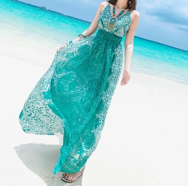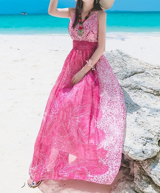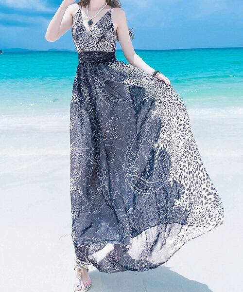 レディース ワンピース フレア キャミワンピース ロング 袖なし ノースリーブ 腕出し Vネック 肌見せ 肩出し ワイド フレア 背中開き 裾ワイド シャーリング シフォン ウエストマーク ふわふわ 異国風 バイカラー 肌見せ かわいい アジアン エスニック エキゾチック 個性的 主役級 存在感 ラブリー キュート プリンセス 豪華 派手 メルヘン 華やか フェアリー ペイズリー 夏 パーティー 旅行 海 ビーチ 体型カバー インスタ映え S M L XL ゆったり ブルー ネイビー ローズレッド