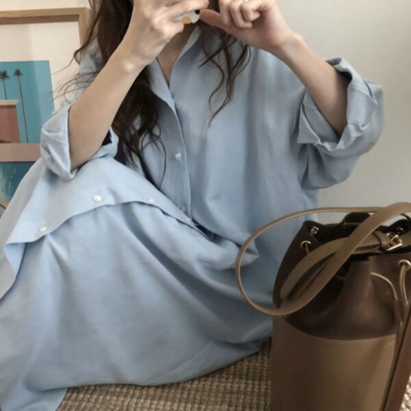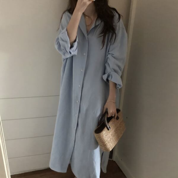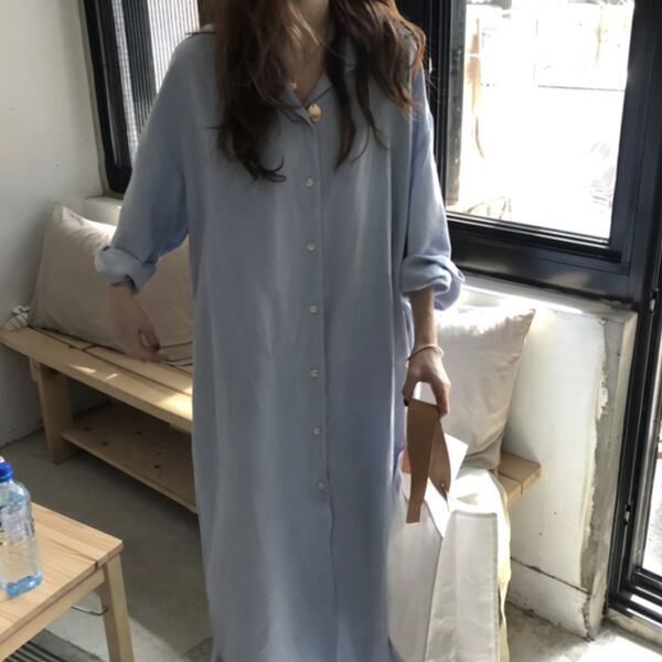 2カラー ルーズなデザイン/シャツスカートレディース トップス ワンピース シャツ ドレス アウター シャツワンピ ロング 丈長 膝下 長袖 ステンカラー ストレート プリーツ ポケット ボタン シンプル ニッチ カジュアル おしゃれ こなれ感 ラフ ルーズ 無地 春 秋 10代 20代 通勤 アウトドア イベント ガーデン ショッピング ライブ 韓国 体型カバー 動きやすい 着瘦せ ゆったり 大きめ オーバーサイズ ホワイト ブルー