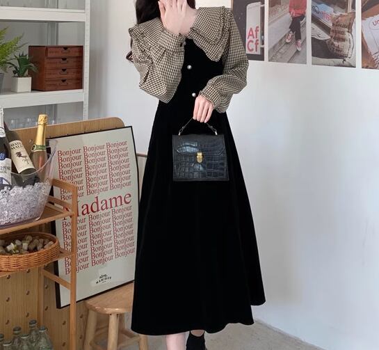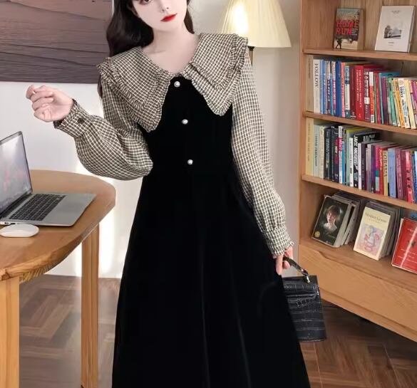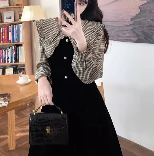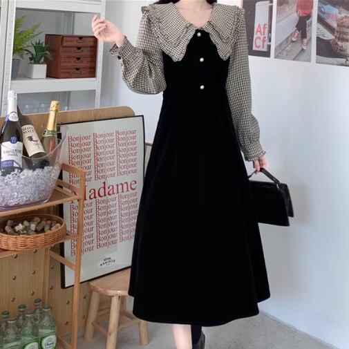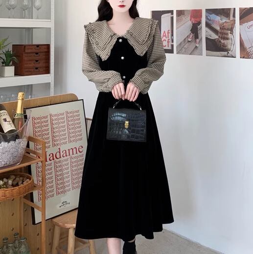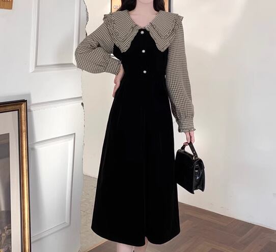 レディース ワンピース プルオーバー 膝下 ミモレ 長袖 襟付き フェミニン フリル かわいい 大人可愛い きれいめ 上品 おしゃれ レトロ ガーリー エレガント ラブリー キュート ロリータ クラシカル 知的 シック 高級感 優しい 穏やか フェアリー 無地 チェック 秋 冬 10代 20代 学生 デート お出かけ 普段使い 清楚 S M L XL ブラック