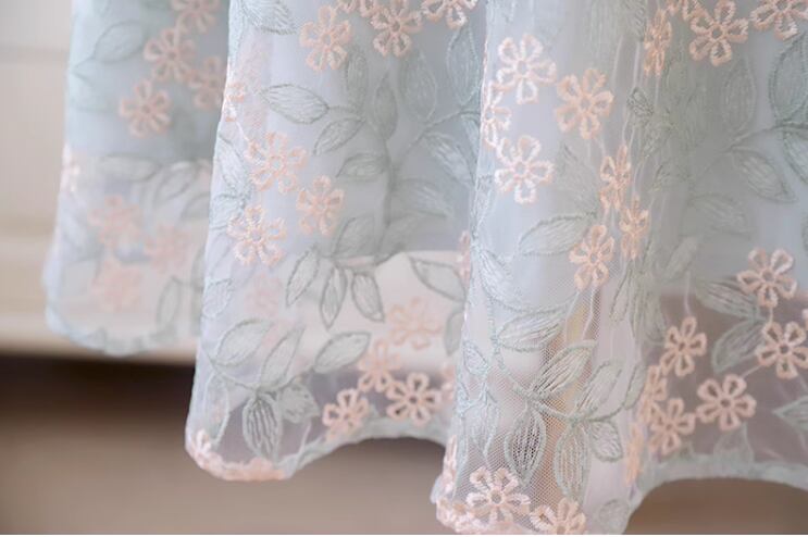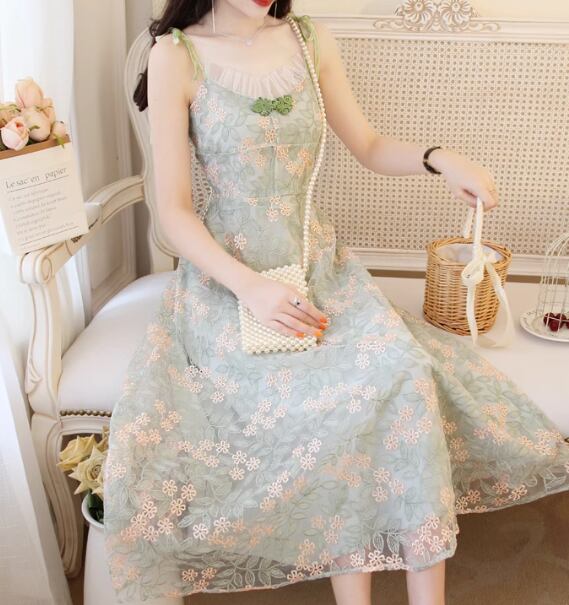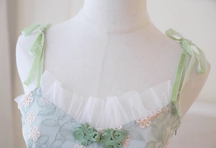 優しげな淡いグリーンの色味と繊細で美しい刺繍が魅力的なノースリーブワンピース。