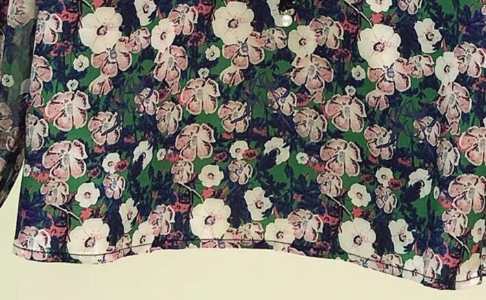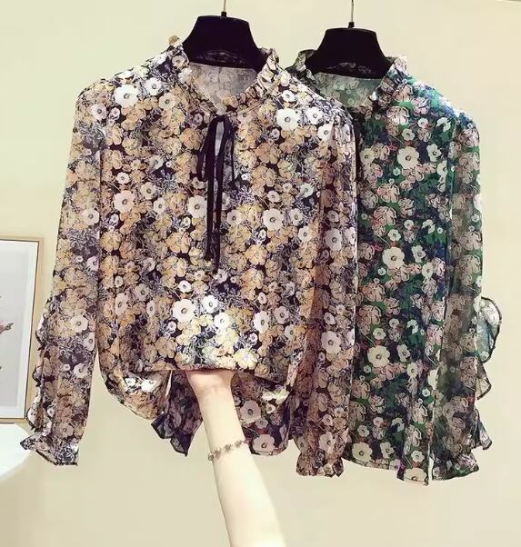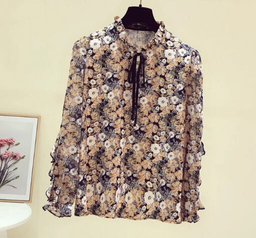 華やかな花柄模様と柔らかなシフォン生地が女性らしい長袖のプルオーバートップス。
